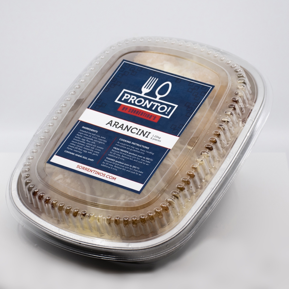 Arancini from Sorrentino’s Restaurant Group! Made from breaded rice ball (rice, extra virgin olive oil, onion, rosemary, thyme, mozzarella, parmigiano, butter, egg, flour, milk, breadcrumbs, canola oil), tomato sauce (tomato, basil, salt, onion, celery, carrot), mozzarella, pasta sheets (00 flour, egg, salt), garlic, thyme, rosemary.