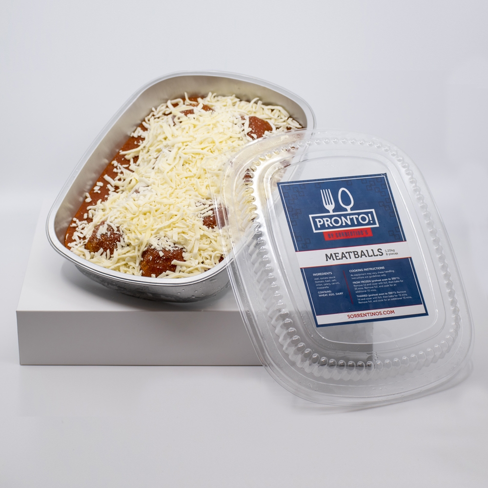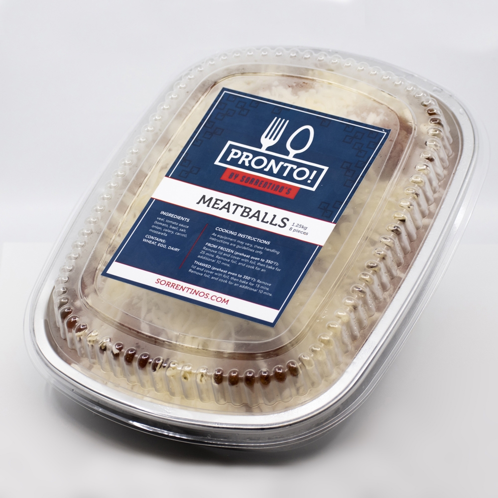 Meatballs from Sorrentino’s Restaurant Group! Made from veal, tomato sauce (tomato, basil, salt,onion, celery, carrot), mozzarella.